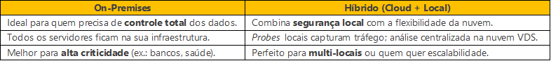 A implementação se adapta à sua infraestrutura e políticas de segurança, com modalidades On Premises (infraestrutura no cliente) ou Mista (Probe no cliente, FrontEnd na nuvem VDS).